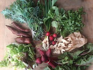 A weekly selection of locally grown veggies, herbs, salads, mushrooms, microgreens, and fruit.